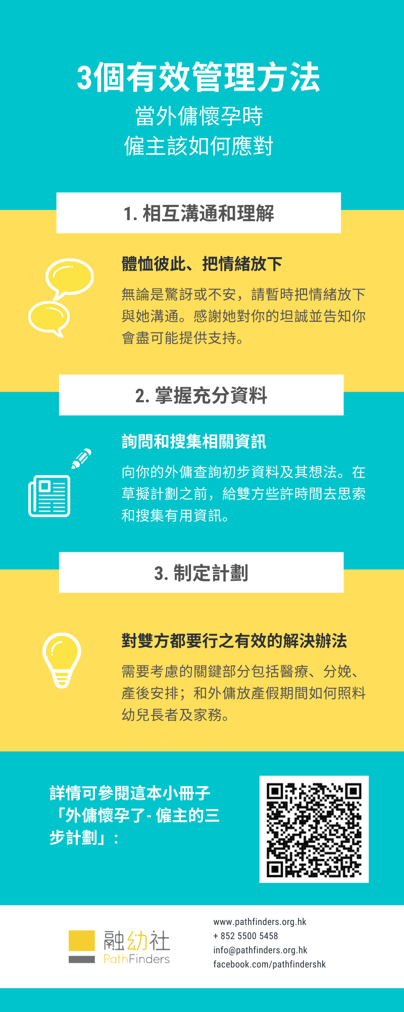 我们可以理解您因突然得知外佣怀孕的消息而引致的复杂心情:分享外佣的喜悦,却担忧她的怀孕可能影响你的家庭运作。问题的确存在;你的外佣能否应付工作需求,同时确保其安全;当她不能工作时,您可能需要寻求照顾你的幼儿的替代方案等等。处理挑战及寻找可行方案的第一步是:明白作为雇主的法律权利及义务、与外佣开心见诚地就相关问题沟通。